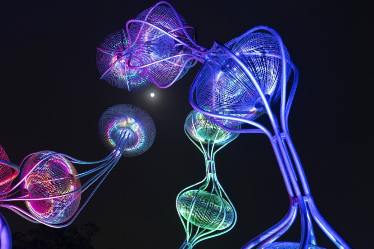Bubble Trees in the Clouds was created specifically for the Innovative Learning Classroom Building of the Texas A&M University. This composition consists of the Struzik’s signature Bubble Tree on a terrace surrounded by glass walls, and a large scale wall art installation basing on a solid aluminum film wallpaper and three-dimensional, foamed PCV grass blade details.